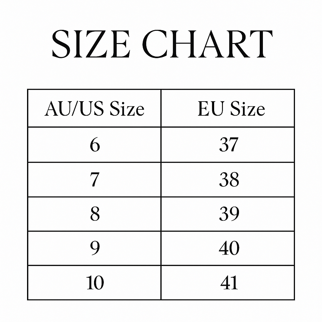 Available Sizes: EU 37, 38, 39, 40, 41 (AU/US equivalent: 6–10)